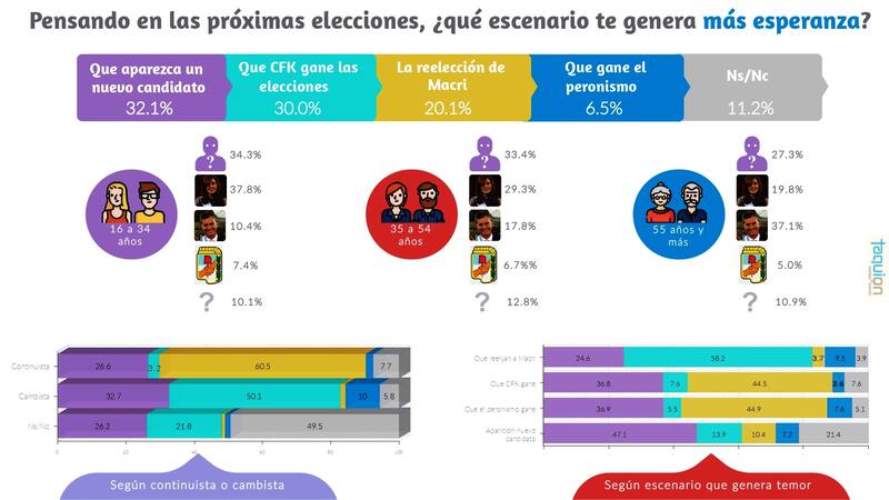 Según el estudio, "al 32,1% de los entrevistados le genera esperanzas de que en la próxima elección aparezca un nuevo candidato por fuera de Cristina y de Macri, ya sea de la política o por fuera de esta".