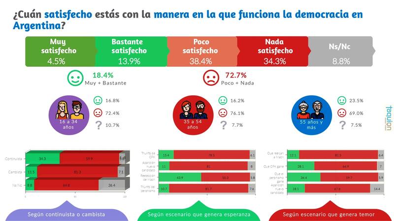 Consultado por su conformidad con el funcionamiento del sistema, a 36 años del retorno a la democracia, sólo el 18,4% mostró algún grado de satisfacción.