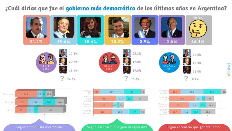 El 21,1% de los consultados considera al radical como el gobernante "más democrático" de los últimos años. Por detrás, aparece Néstor Kirchner con el 19,6% mientras que su esposa, Cristina Kirchner le sigue con 18,6%. En el otro extremo, Fernando De la Rúa aparece como el "peor valorado" con el 2,5%.