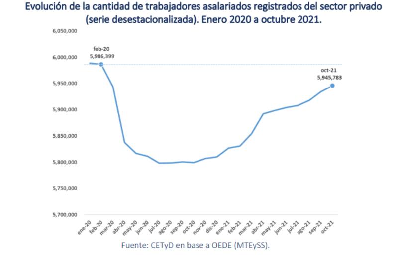 Según el estudio, los indicadores laborales recientes son alentadores pero indicativos de los desafíos que vienen: "En particular, entre los meses octubre de 2020 y 2021, se recuperó el 78% de los empleos registrados del sector privado destruidos entre febrero y octubre de 2020.Apenas estamos volviendo a la hora cero".