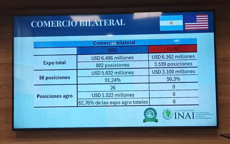 Durante una presentación en la Bolsa de Cereales de Buenos Aires, Maximiliano Moreno de Fundación INAI, aseguró que un acuerdo de 50 posiciones con la administración de Donald Trump, cubriría el 91% de las exportaciones.