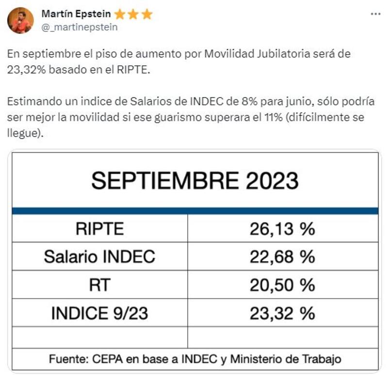 Según indicó MartínEpstein, economista del CEPA, la suba "será de 23,32% basado en el índice de Remuneración Imponible Promedio de Trabajadores Estables (RIPTE).