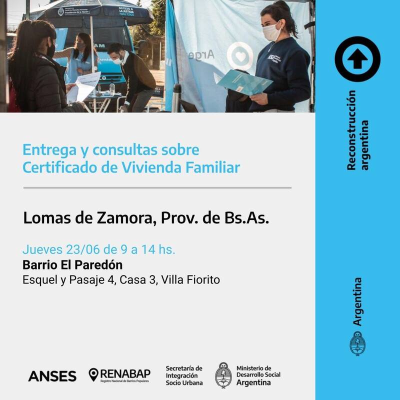 El Ministerio de Desarrollo Social a través de la Secretaría de Integración Urbana junto a la Administración Nacional de la Seguridad Social (ANSES) activan este jueves 23 de junio, un nuevo operativo territorial de entrega y consultas sobre el Certificado de Vivienda Familiar.