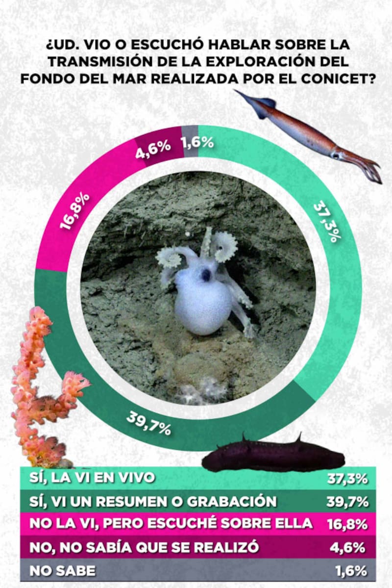 La transmisión del CONICET, que mostró en tiempo real la exploración del Talud Continental IV, fue vista en vivo por el 37,3% de los encuestados, mientras que otro 39,7% la siguió en diferido o a través de resúmenes. En total, casi el 80% de la población se relacionó con el evento. "Un abrumador 77% afirma haberlo visto o haber escuchado al respecto", señala el informe. En un país donde los niveles de atención suelen estar monopolizados por la política y el fútbol, este dato no es menor.