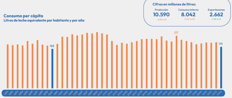 En relación a lácteos, el informe destaca que hay que remontarse a 1990 para encontrar un año con consumo similar al 2024. en tanto que la producción de 10.590 millones de litros, representa una caída interanual de 6,5% y el consumo Interno de 8.042 millones, un descenso de 9,1%, en relación a 2023.
