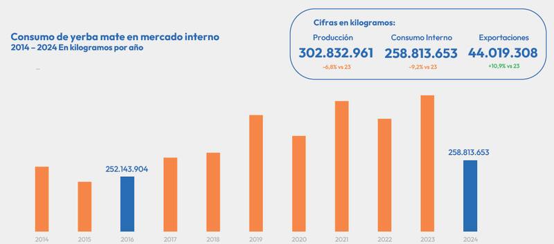 Del mismo modo, el consumo tradicional de yerba en el mercado interno presentó una baja de 9,2% en relación al 2023 y fue el nivel de consumo más bajo desde el 2016 con un retroceso de 6,8% en la producción.