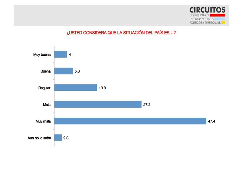 Sobre la situación del país, un 47,4% consideró que es muy mala, un 27,2% que es mala, un 13,3% que es regular, y solo un 5,8% opinó que es buena y un 4% muy buena. Pasando de lo general a lo individual, se les preguntó a los encuestados "¿Considera que su situación económica en los próximos meses puede...?" a lo que el 35,2% dijo empeorar, el 28,9% empeorar mucho, el 16,8% mantenerse igual, el 8,7% mejorar, el 4,6% mejorar mucho y el 5,8% dijo no saber.