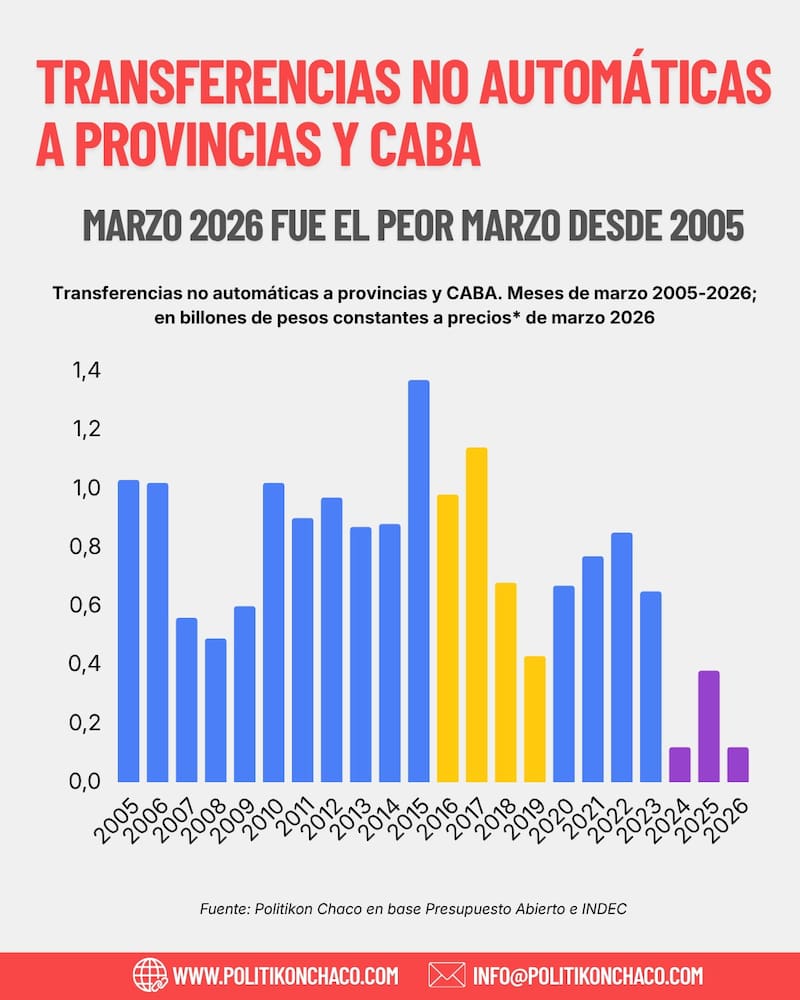 En marzo de 2026, las transferencias no automáticas del gobierno nacional a provincias y CABA totalizaron $ 115.956 millones (etapa pagada), presentando descenso del 69,1% interanual en términos reales. Se trata del peor mes de marzo desde 2005.