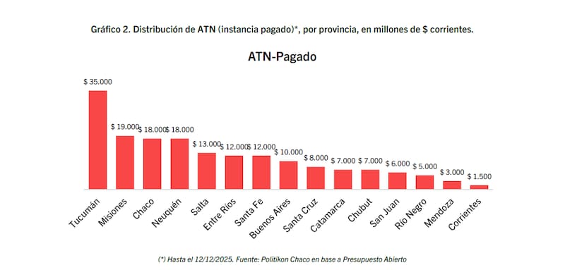 Con los datos parciales de diciembre, hasta el momento son quince las provincias que recibieron ATN en el año lideradas por Tucumán con $ 35.000 millones, seguido por Misiones con $ 19.000 millones y Chaco y Neuquén con $ 18.000 millones en cada caso.