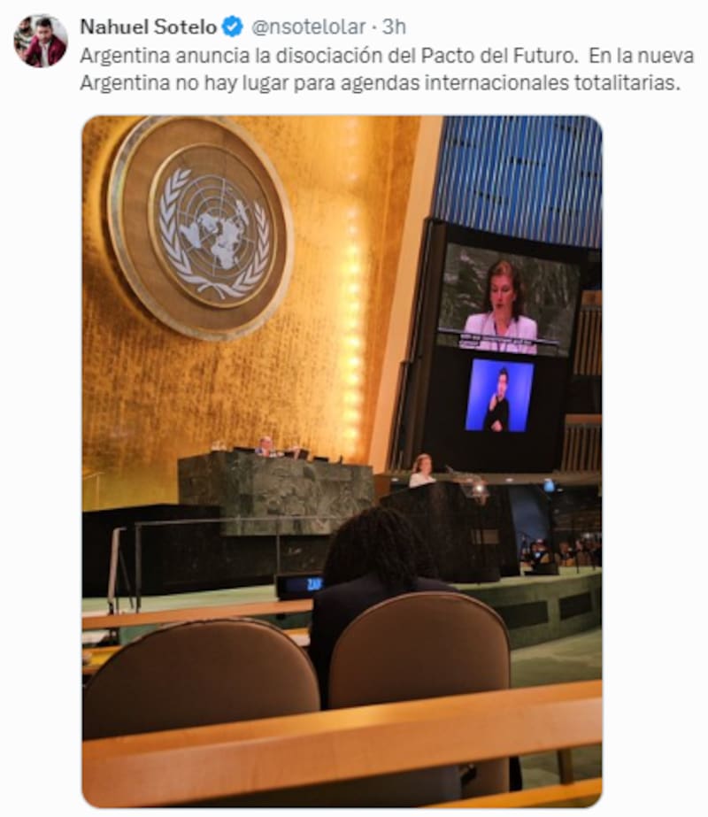 "Argentina anuncia la disociación del Pacto del Futuro. En la nueva Argentina no hay lugar para agendas internacionales totalitarias", confirmó también el secretario de Culto y Civilización, Nahuel Sotelo, a cargo del área legal que revisa los tratados internacionales y el alineamiento de la Argentina. El funcionario nacional lo anunció en sus redes sociales junto a una foto de la canciller Diana Mondino en el momento en que oficializaba la postura de la Argentina sobre el tema en la cumbre en Nueva York.