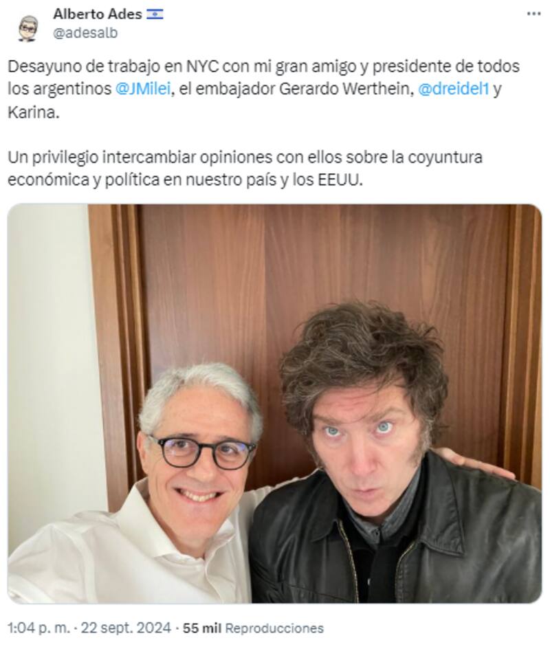 "Desayuno de trabajo en NYC con mi gran amigo y presidente de todos los argentinos @JMilei, el embajador Gerardo Werthein, @dreidel1 y Karina", sostuvo el economista.
