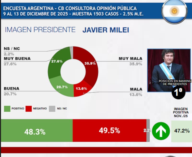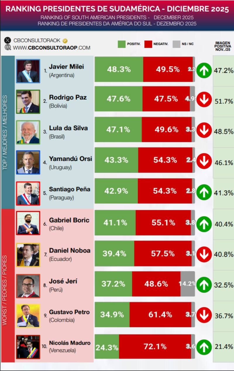Javier Milei cerró diciembre de 2025 en lo más alto del ranking de presidentes de Sudamérica elaborado por CB Consultora Opinión Pública.