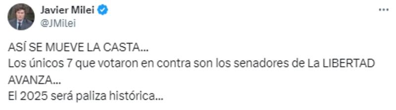 Milei amplió el mensaje de las redes sociales con distintos reposteos en X (Twitter) de cuentas libertarias afines donde se comparte el video de la votación y críticas de "casta" a los legisladores que aprobaron el fuerte aumento de dietas.