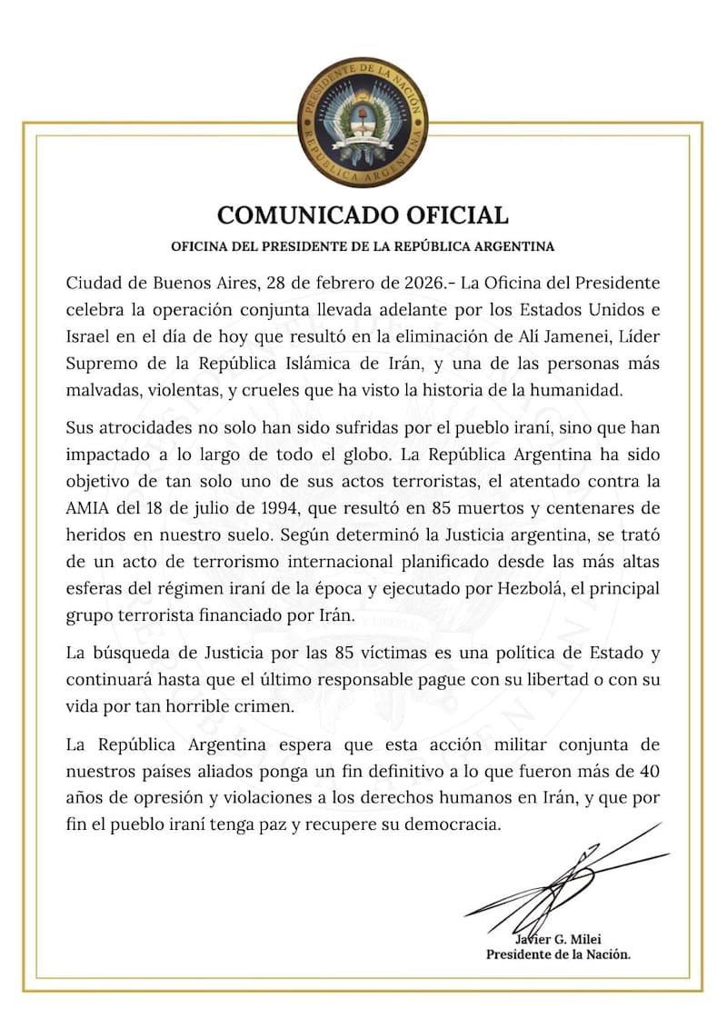La Oficina del Presidente de la Nación difundió este sábado un comunicado oficial en el que Javier Milei celebró la muerte de Alí Jamenei, líder supremo de la República Islámica de Irán, tras el ataque conjunto lanzado por Estados Unidos e Israel sobre Teherán.