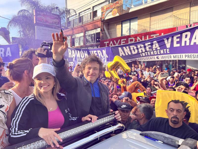 Al igual que en todas las recorridas hechas en el distrito bonaerense, Milei llevó arriba de su camioneta a la candidata a gobernadora Carolina Píparo y, como novedad, sumó en su aparición al postulante a la jefatura de Gobierno porteña Ramiro Marra.