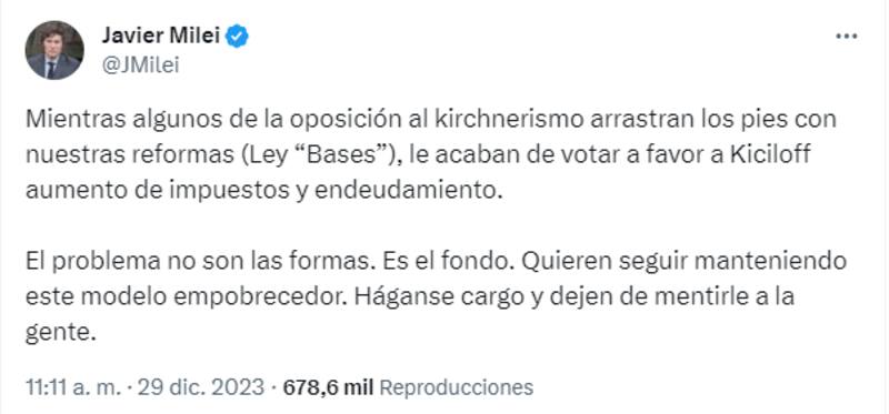 "Mientras algunos de la oposición al kirchnerismo arrastran los pies con nuestras reformas (Ley "Bases"), le acaban de votar a favor a Kiciloff aumento de impuestos y endeudamiento. El problema no son las formas. Es el fondo.Quieren seguir manteniendo este modelo empobrecedor. Háganse cargo y dejen de mentirle a la gente", tuiteó de manera furibunda el presidente.