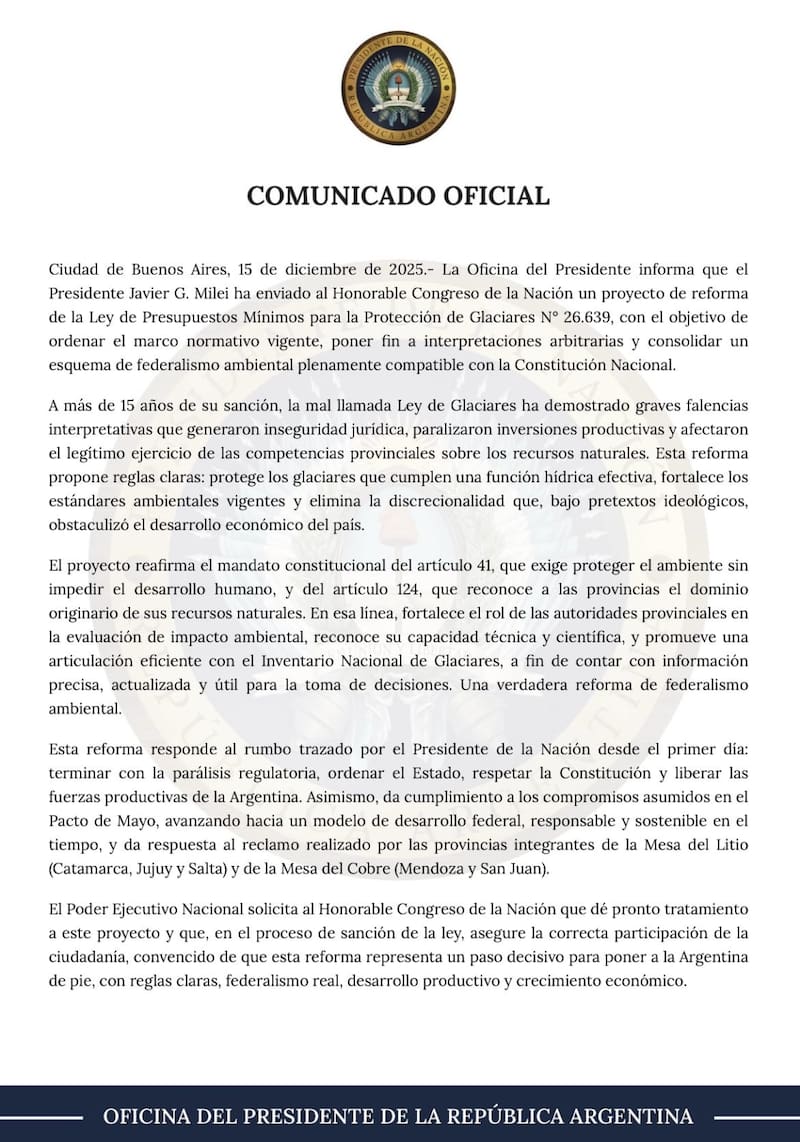 El presidente Javier Milei envió al Congreso un proyecto de reforma de la Ley de Presupuestos Mínimos para la Protección de Glaciares Nº 26.639, según informó este domingo la Oficina del Presidente mediante un comunicado oficial. La iniciativa busca “ordenar de manera urgente” el marco normativo ambiental y “consolidar un esquema de federalismo ambiental plenamente compatible con la Constitución Nacional”.