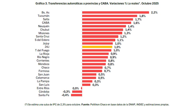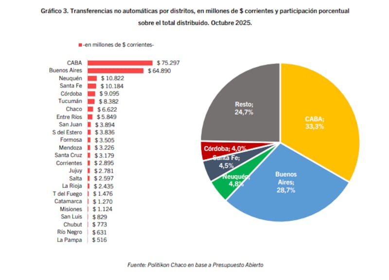 Según Politikon Chaco, las transferencias no automáticas del Estado Nacional a provincias y CABA (etapa pagado) cayeron 28,7% interanual en términos reales durante octubre de 2025. Fue el peor octubre en dos décadas, aunque con un dato clave: al excluir a la Ciudad de Buenos Aires, el resto de las provincias mostró una suba del 4,2% real.