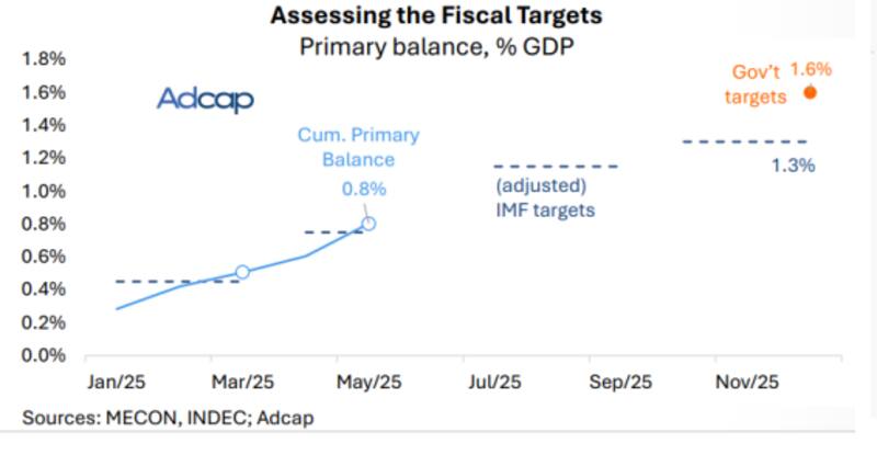 En el acuerdo con el FMI, el organismo le había impuesto una meta de superávit fiscal 1,3% del PBI. Sin embargo, el Gobierno redobló la apuesta y señaló que buscará alcanzar un superávit del 1,6% del PBI. El desempeño fiscal acumulado se encuentra por detrás del nivel alcanzado en el mismo período del año pasado, lo que sugiere que será necesario un ajuste fiscal adicional para cumplir con la meta anual del 1,6% del PBI.