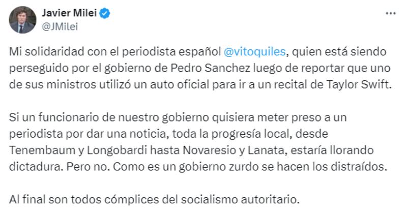 En este contexto, Milei se solidarizó con Quiles y posteó: "Si un funcionario de nuestro Gobierno quisiera meter preso a un periodista por dar una noticia, toda la progresía local, desde Tenembaum y Longobardi hasta Novaresio y Lanata, estaría llorando dictadura".