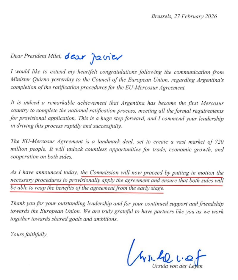 on der Leyen agregó de puño y letra un más cercano “Dear Javier”, un detalle que no pasó inadvertido en la Casa Rosada y que refleja el tono personal del vínculo que busca construir Bruselas con el mandatario argentino.