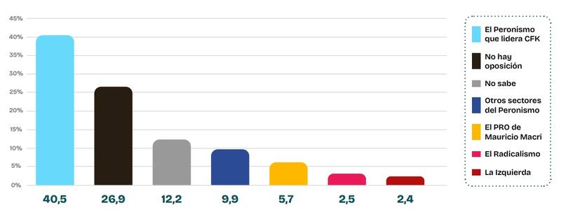 Si bien es mayoritario el grupo que cree que la oposición llegará débil a las elecciones (44,2%), también arrojó sorpresas la identificaciones de los líderes que pueden encabezar ese espacio. El "peronismo de CFK" supera el 40%, más del 25% cree que no hay oposición, y el 12% dijo "no saber". El Pro sólo aparece en quinto lugar, con 5,7%.