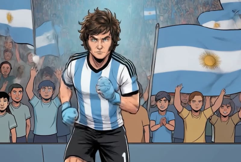 La pieza propone una narración que ubica al propio Milei en el centro de la escena, como protagonista casi excluyente de un partido imaginario en el que la Argentina enfrenta obstáculos heredados y logra revertirlos. En ese recorrido, el Presidente aparece como arquero —en alusión a su pasado en Chacarita— pero también como un jugador ofensivo, una mezcla que en los hechos lo acerca más a un número diez que a un guardameta.