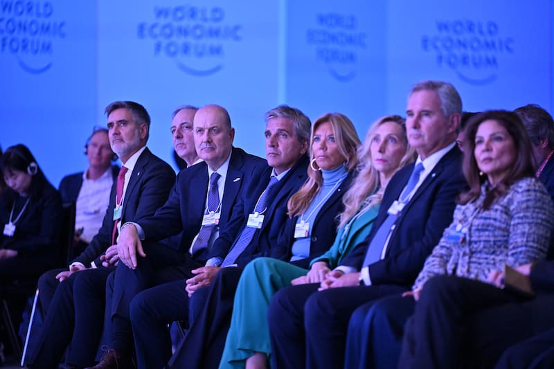 En la primera fila estaban los incondicionales: Karina, el ministro de Economía Luis Caputo, el canciller Pablo Quirno, el ministro de Desregulación Federico Sturzenegger y otros funcionarios de su entorno como el cineasta Santiago Oría. También los empresarios Alejandro Bulgheroni, Martín Eurnekian, Bettina Bulgheroni y Gregorio Whertein, entre otros, junto con la anfitriona del WEF, Marisol Argueta, ex canciller de El Salvador.