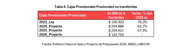 Ajustado por la inflación estimado para 2026, el crédito presupuestario para transferencias a Cajas Previsionales Provinciales caería ese año un 57,9% en términos reales respecto al crédito asignado en el proyecto de presupuesto 2025, mientras que respecto al proyecto 2024 está -62,7%. Si se compara, a su vez, con la Ley de Presupuesto 2023, estos fondos están -76,3% en términos reales.