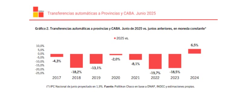 Según la consultora Politikón Chaco, las transferencias automáticas en junio de este año crecieron un 6,5%, apoyada en leyes especiales y compensaciones.