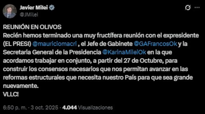 "Recién hemos terminado una muy fructífera reunión con el expresidente (EL PRESI) Mauricio Macri, el Jefe de Gabinete Guillermo Francos y la Secretaria General de la Presidencia Karina Milei, en la que acordamos trabajar en conjunto, a partir del 27 de octubre, para construir los consensos necesarios que nos permitan avanzar en las reformas estructurales que necesita nuestro País para que sea grande nuevamente", dijo Milei sobre el encuentro que se extendió por casi dos horas.