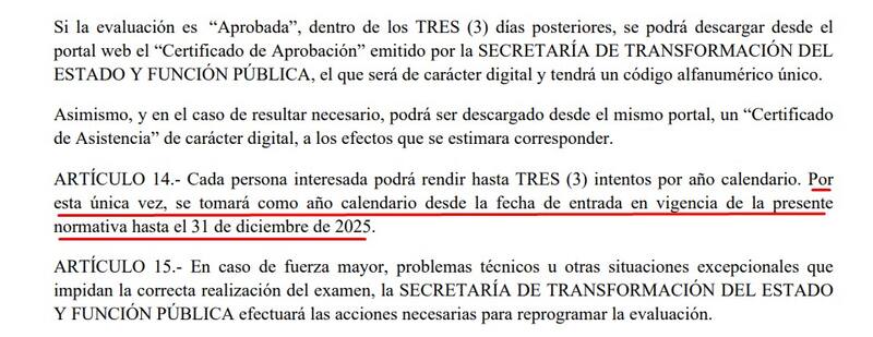 Recién entonces, si durante ese período la persona aprueba la evaluación, el contrato se le renovaría hasta el 31 de diciembre de 2025, tal cual lo sugiere el artículo 14 del Reglamento donde se fijan las tres chances y dice que "por esta única vez, se tomará como año calendario desde la fecha de entrada en vigencia de la presente normativa hasta el 31 de diciembre de 2025". Así y todo, al igual que rendir el examen será condición excluyente para ingresar al Estado en el futuro, no equivaldrá ahora a una garantía de renovación a futuro.