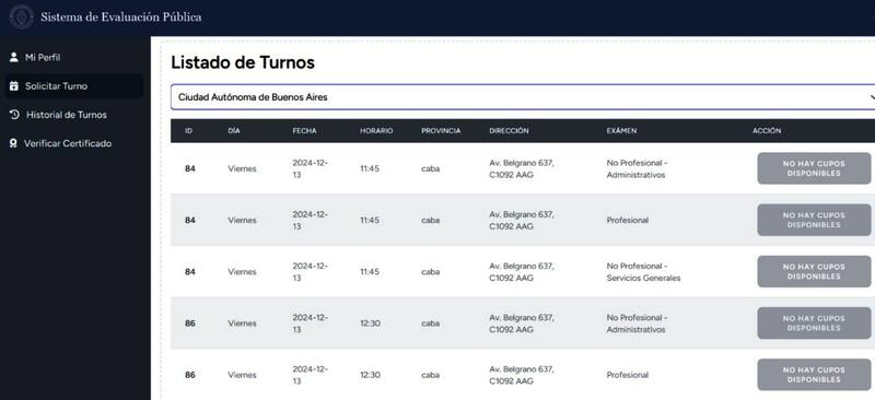 Desde fines de la semana pasada, el Gobierno habilitó la oferta de turnos entre las 9:30 y las 17:30 con una única sede disponible, el Instituto Nacional de la Administración Pública (INAP), en la avenida Belgrano 600. No obstante, quienes intentaron ingresar en las últimas horas se llevaron una sorpresa: ya no hay turnos disponibles porque todos fueron asignados. Fuentes gremiales estiman que unas 10 mil personas ya se inscribieron para tomar el examen.