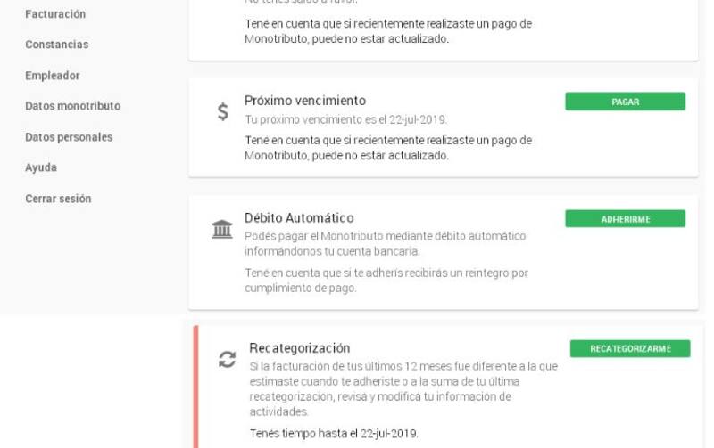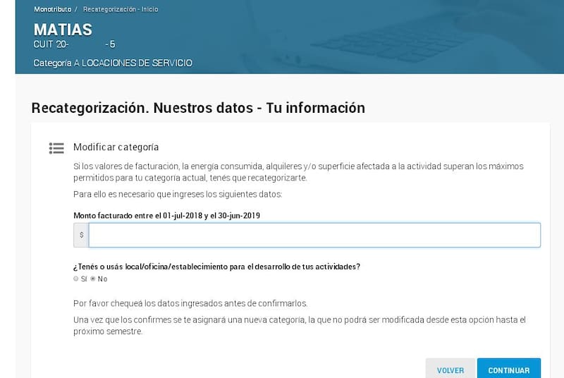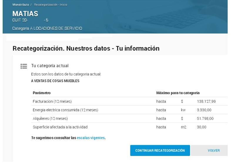 Para recategorizarse, porque cambiaron los parámetros o para mantenerse en la escala actual, el contribuyente debe presionar el botón Continuar Recategorización.