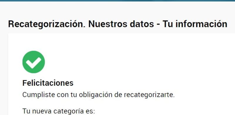 El sistema informará que la operación se hizo correctamente y en qué categoría queda el contribuyente para los próximos seis meses. Así como habililta la posibilidad de imprimir la nueva credencial.