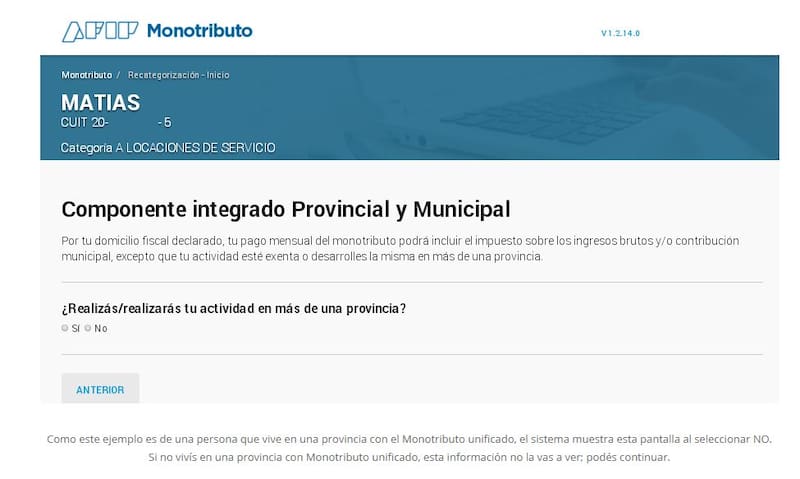 El sistema entonces preguntará si el contribuyente se encuentra en una provincia con Monotributo unificado, si no es el caso, no informará sobre el componente integrado.