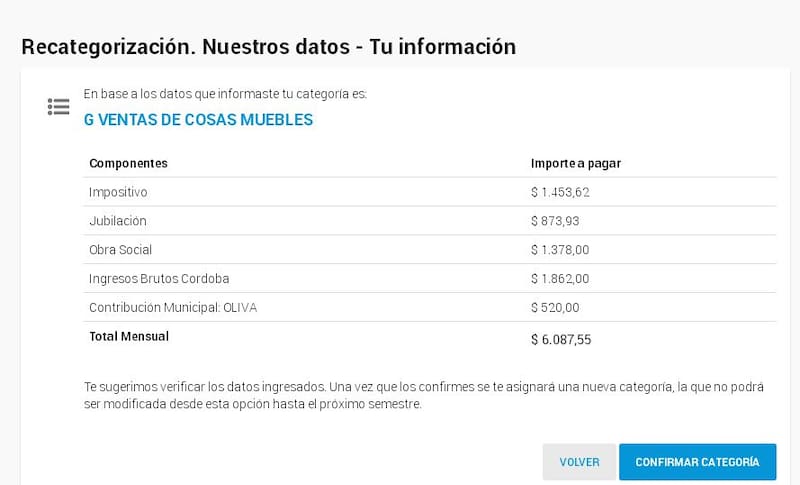 El sistema desplegará la categoría que le corresponde al contribuyente de acuerdo con los datos que aportó. Debe verificar los datos antes de aceptar, dado que este paso es el último en el que se permiten modificar la información aportada.