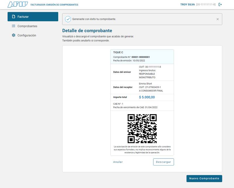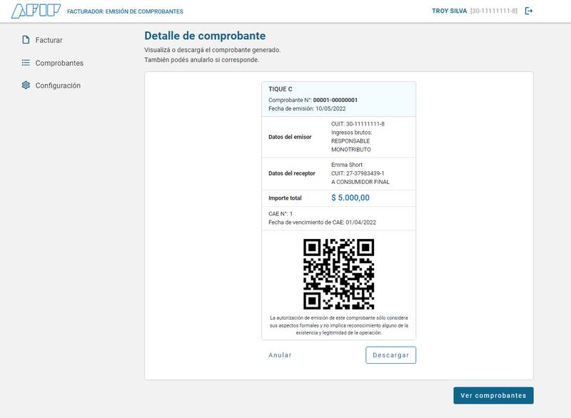 Finalmente, el sistema mostrará el comprobante generado. Se puede descargar, anular o generar uno nuevo. En caso de anularlo, se emitirá un ticket nota de crédito C asociado al comprobante seleccionado.