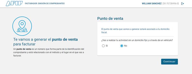 Antes de generar el primer comprobante deberás seleccionar el punto de venta con el que vayas a operar. Si es el primer punto de venta que creás, deberás indicar si la actividad se desarrollará en un domicilio fijo o no. Luego presioná "Continuar".