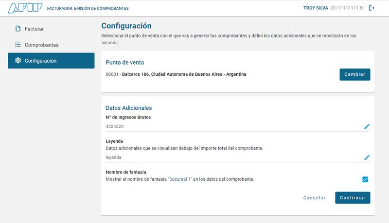 Desde el botón "Configuración" en el menú lateral, vas a poder modificar los datos de la plantilla de comprobantes. También podés indicar que se visualice un nombre de fantasía. Para eso, tildá el recuadro que aparece a la derecha.