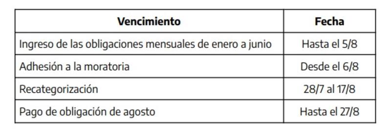 El organismo recaudador aclaró, además, que "para el pago de los tres componentes de la cuota del monotributo de agosto -impositivo, obra social y jubilación- regirán los valores correspondientes a la recategorización que comenzó el 28 de julio y que se extiende hasta el 17 de agosto".