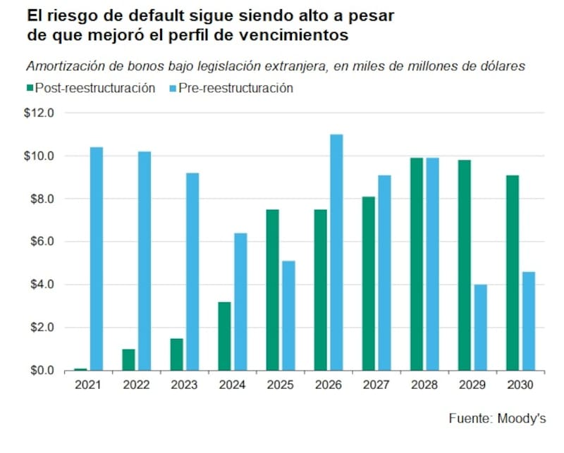 Estos ingresos extraordinarios, que hace unos meses eran impensados, no reducen para Moody's la probabilidad de un default de la deuda externa con acreedores privados, a pesar de que fue renegociada hace menos de un año y despejó vencimientos por cerca de u$s 30.000 millones hasta 2024 inclusive, debido a la ausencia de un acuerdo con el FMI y "de un cambio material en el marco de políticas macroeconómicas".