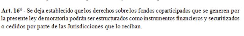 "Se deja establecido que los derechos sobre los fondos coparticipados que se generen por la presente ley de moratoria podrán ser estructurados como instrumentos financieros y securitizados o cedidos por parte de las Jurisdicciones que lo reciban", dice la norma.