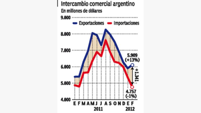 En el primer bimestre, la balanza comercial fue superavitaria en u$s 1.892 millones, un aumento de 69% respecto del mismo período de 2011. Se exportó por u$s 12.007 millones y se importó por u$s 10.115 millones. La suba de las compras al exterior en el bimestre fue de 5% interanual.