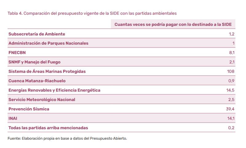 "Esta caída es desigual entre las áreas: mientras que nueve de las diez partidas ambientales analizadas caen en términos reales entre un 28,1% y un 83,2%, la Deuda Pública lo hace en un 21,2%, un porcentaje menor al presupuesto general. En este contexto, la Secretaría de Inteligencia del Estado tuvo un aumento de su presupuesto real de un 19,2%", marcaron.