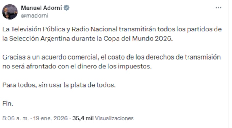 “La Televisión Pública y Radio Nacional transmitirán todos los partidos de la Selección Argentina durante la Copa del Mundo 2026. Gracias a un acuerdo comercial, el costo de los derechos de transmisión no será afrontado con el dinero de los impuestos. Para todos, sin usar la plata de todos", escribió el funcionario.