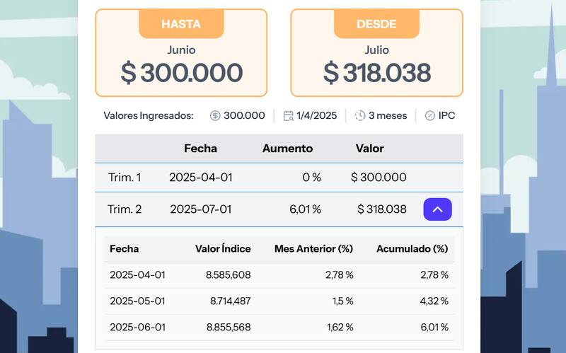 Por ejemplo, una persona que inició su contrato trimestral en abril 2025 a $ 300.000 deberá abonar $ 318.038 en su próxima actualización.