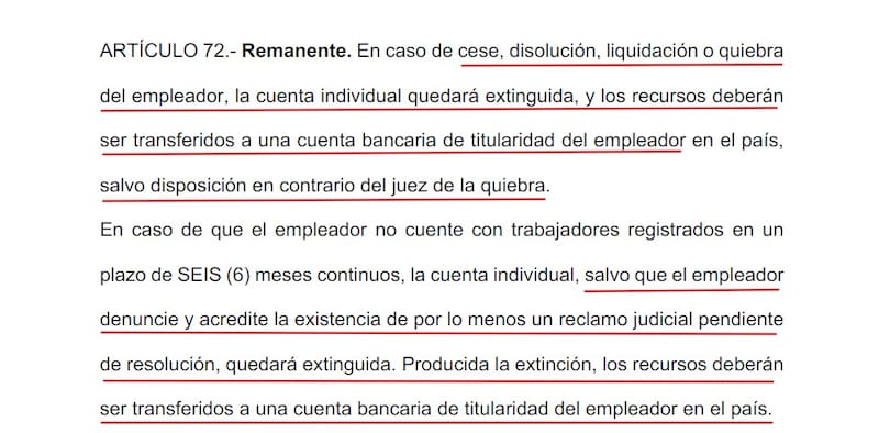 El artículo 72 del proyecto, titulado “Remanente”, establece que “en caso de cese, disolución, liquidación o quiebra del empleador, la cuenta individual quedará extinguida, y los recursos deberán ser transferidos a una cuenta bancaria de titularidad del empleador en el país, salvo disposición en contrario del juez de la quiebra”. La misma lógica se aplica si el empleador no registra trabajadores durante un período de seis meses continuos, salvo que acredite la existencia de un reclamo judicial pendiente.