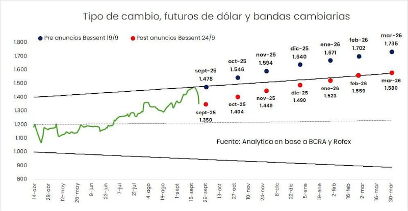 Antes del tweet de Bessent, consideraban que el dólar oficial mayorista cerraría septiembre en el techo de la banda cambiaria ($ 1.478). Mientras que en octubre proyectaban que subiría a $ 1.546; noviembre, $ 1.594; y diciembre, $ 1.640.