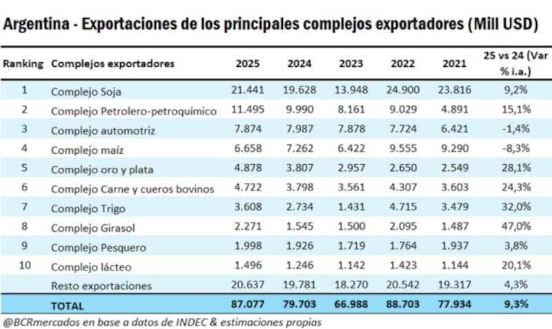 En lo referido al año 2025, la mayor parte de los complejos exportadores creció en valor exportado salvo Complejo Maíz que cayó 8,3% i.a. y el Automotriz que descendió 1,4% i.a.